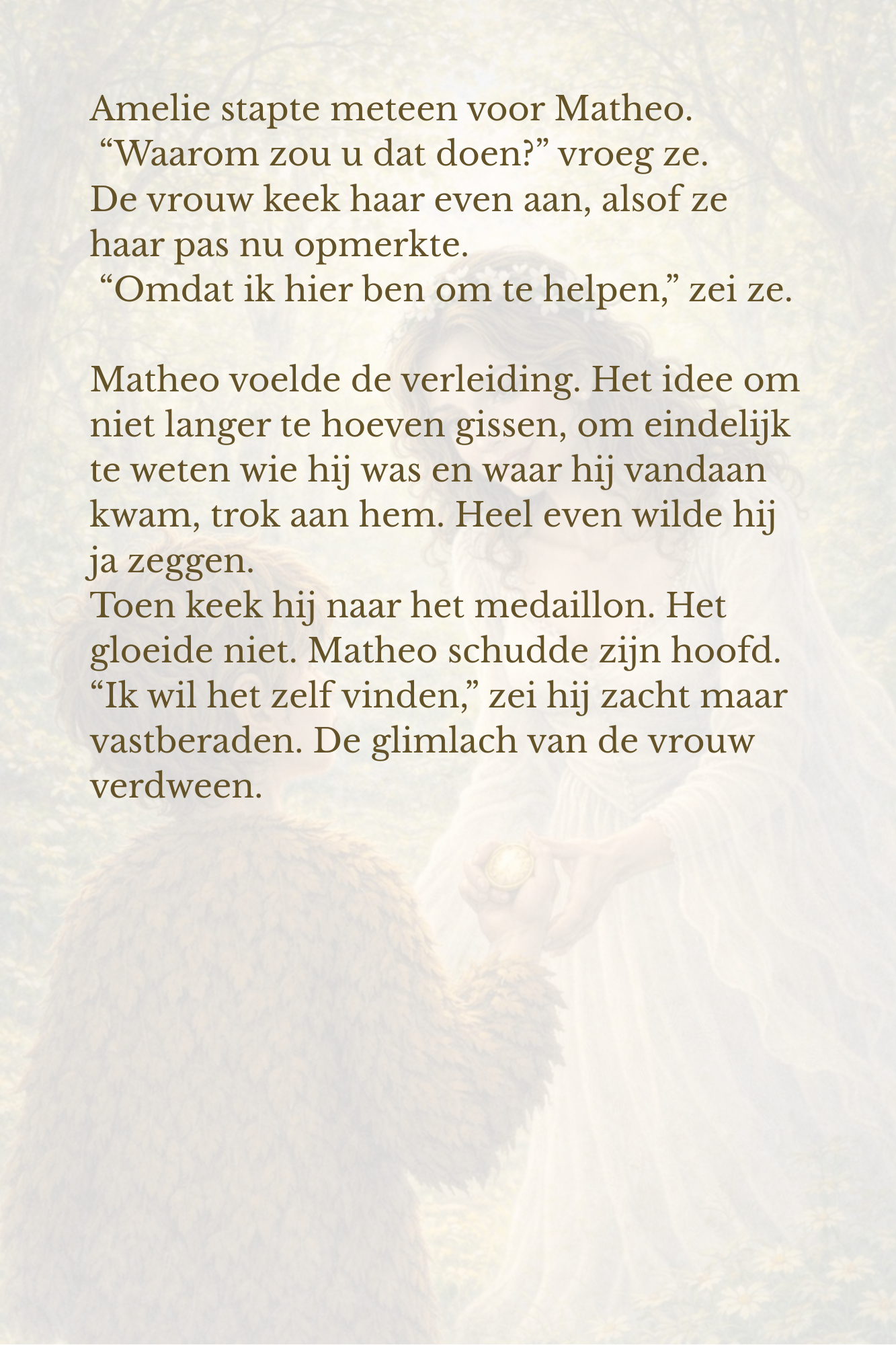 Samen met Amelie en hun trouwe dierenvrienden – de vos, de uil, de kikker en de egel – begint hij aan een zoektocht naar antwoorden. Wat betekent het medaillon? Waarom lijkt het hen te beschermen? En waarom voelt Matheo dat zijn verhaal nog niet compleet is?
