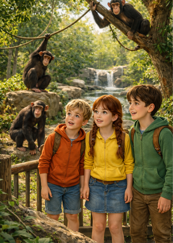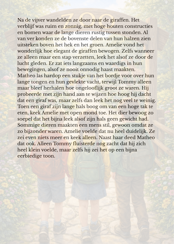 Op een zonnige dag trekken Amelie, Tommy en Matheo vol verwondering door de dierentuin. Alles lijkt rustig en mooi, tot het jonge olifantje Bono plots verdwenen is. Terwijl bezoekers fluisteren en verzorgers ongerust zoeken, merken de drie kinderen kleine dingen op die anderen missen: sporen in het zand, een open zijpoort en aanwijzingen die steeds duidelijker maken dat Bono alleen ergens rondloopt. Vastberaden besluiten ze mee te helpen. Hun zoektocht voert hen langs modderige paden, dichte struiken en spannende reddingsmomenten waarin moed, vriendschap en slim nadenken het verschil maken. Samen met Mevrouw Sofia en de verzorgers doen ze alles om Bono veilig terug bij zijn mama te brengen. Maar net wanneer de rust lijkt terug te keren, ontdekken de kinderen iets onverwachts: een oude bronzen sleutel met een olifant erop, verborgen in de aarde achter het verblijf. Dan voelen ze een vreemde trilling onder hun voeten. Wat begon als een reddingsactie, eindigt in een mysterie dat nog maar net ontwaakt. Amelie in de zoo is een warm, spannend en sprookjesachtig avontuur over dierenliefde, vriendschap, dapper zijn en geheimen die diep onder de zoo verborgen liggen.